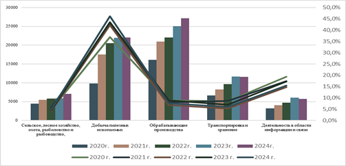 Анализ отраслевой структуры экономики за 2020–2024 годы подтвердил существенную дифференциацию налоговой нагрузки по ключевым секторам (Рисунок 6). В 2024 году обрабатывающие производства, формирующие 16,5% ВРП, несли налоговую нагрузку 7,6%, что отражает продолжающееся стимулирование производственного сектора. Добыча полезных ископаемых при доле 13,4% ВРП характеризовалась максимальной налоговой нагрузкой 46,2%, обусловленной механизмами изъятия природной ренты.