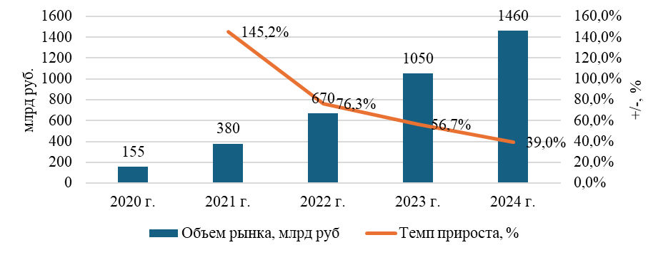 Рис. 1. Динамика объема рынка онлайн-продаж продуктов питания в России, 2020-2024 гг., млрд. руб.