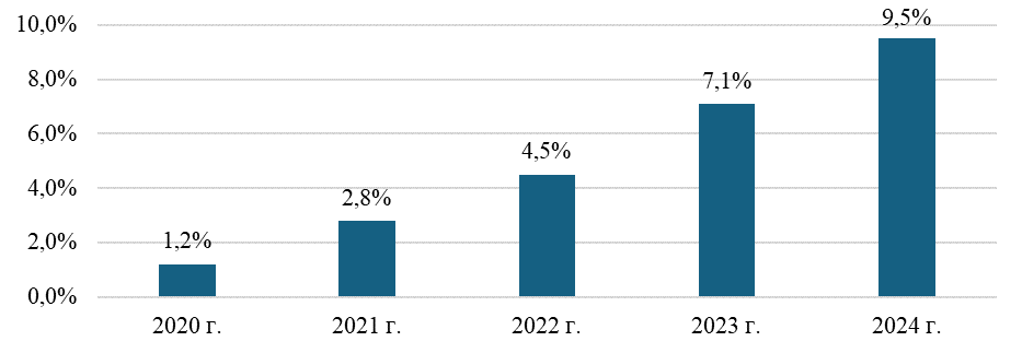 Рис. 2. Доля онлайн-продаж в общем объеме продуктового ритейла в России, 2020-2024 гг., %