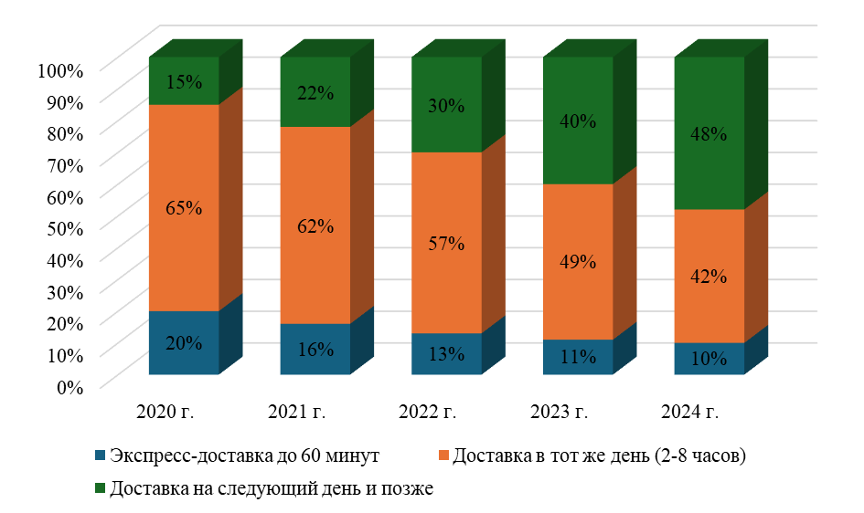 Данные, представленные на рисунке 4, демонстрируют значительные изменения в предпочтениях потребителей относительно сроков доставки продуктов питания. Если в 2020 году на экспресс-доставку (до 60 минут) приходилось лишь 15% заказов, то к 2024 году этот показатель вырос до 48%. В то же время доля доставки в тот же день (2-8 часов) снизилась с 65% до 42%, а доставка на следующий день и позже сократилась с 20% до 10%. Это свидетельствует о растущем спросе на быструю доставку продуктов и соответствующей адаптации бизнес-моделей участников рынка.
