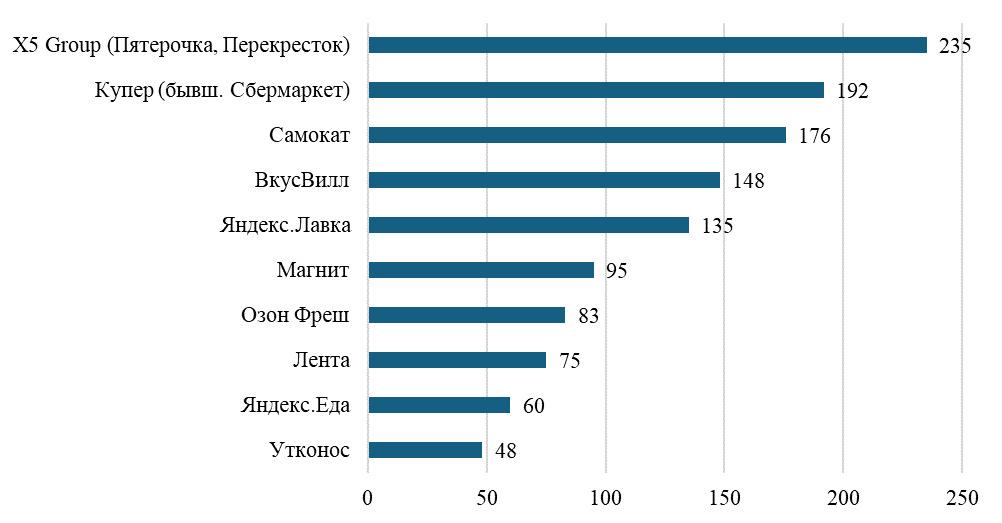 Согласно данным, представленным на рисунке 5, лидером рынка онлайн-продаж продуктов питания в России в 2024 году является X5 Group (сервисы «Перекресток.Впрок», «Пятерочка Доставка») с выручкой 235 млрд рублей. На втором месте находится Купер (бывший «Сбермаркет») с выручкой 192 млрд рублей, на третьем – Самокат с выручкой 176 млрд рублей. В топ-5 также входят ВкусВилл (148 млрд рублей) и Яндекс.Лавка (135 млрд рублей). Следует отметить, что в рейтинге представлены как традиционные офлайн-ритейлеры, развивающие онлайн-направление (X5 Group, Магнит, Лента, ВкусВилл), так и специализированные сервисы доставки продуктов (Самокат, Яндекс.Лавка) и агрегаторы (Сбермаркет, Яндекс.Еда).