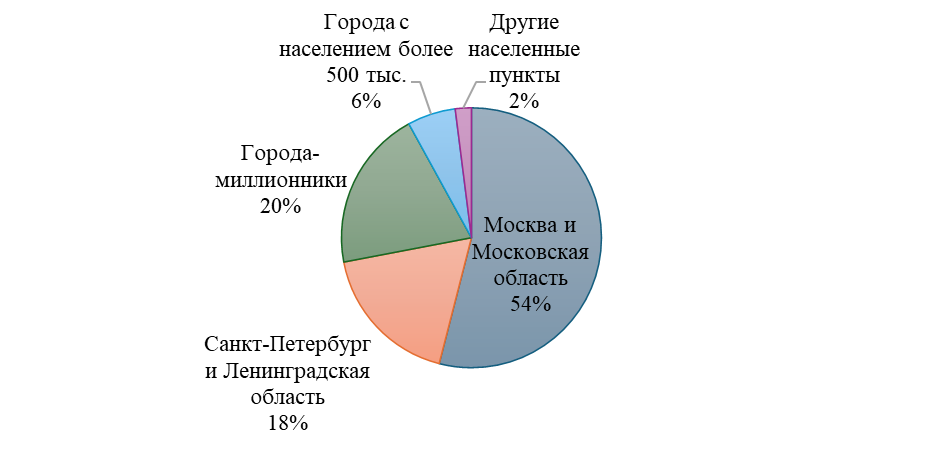Анализ географической структуры рынка онлайн-продаж продуктов питания показывает, что в 2024 году более половины объема рынка (54%) приходится на Москву и Московскую область. Значительную долю занимает также Санкт-Петербург и Ленинградская область (18%). На города-миллионники приходится 20% рынка, на другие города с населением более 500 тыс. человек – 6%, на остальные населенные пункты – всего 2%. Такая неравномерность географического распределения объясняется различиями в уровне развития логистической инфраструктуры, плотности населения, уровне доходов и цифровой грамотности населения в разных регионах страны.