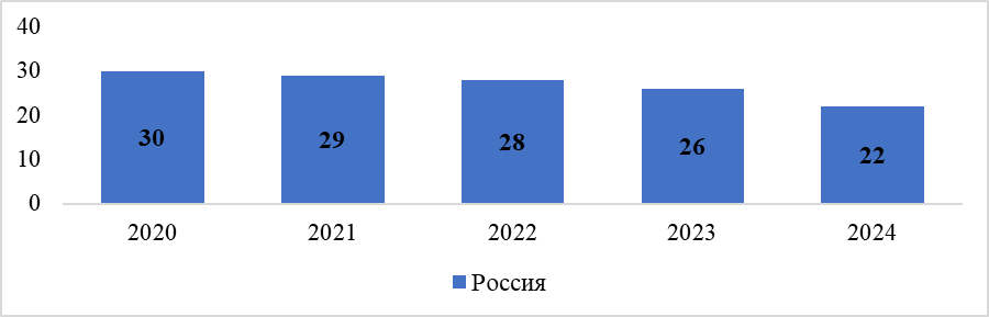 Анализ «Индекса восприятия коррупции» в России за период 2020-2024 гг. демонстрирует устойчиво негативную тенденцию. Данные свидетельствуют о последовательном снижении оценки, указывая на ухудшение ситуации с восприятием коррупции в стране.