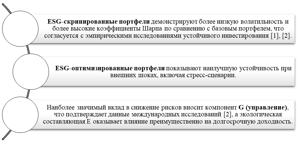 Представленные данные демонстрируют, что включение ESG-критериев в инвестиционный процесс существенно повышает устойчивость портфельных стратегий. ESG-скринированные портфели снижают волатильность и улучшают коэффициенты эффективности по сравнению с базовыми портфелями, что подтверждается эмпирическими исследованиями [1], [2]. ESG-оптимизированные портфели показывают наилучшую устойчивость к стресс-сценариям и внешним рыночным шокам, что делает их предпочтительными для долгосрочных инвесторов. Наиболее существенный вклад в снижение рисков вносит компонент G (управление), тогда как экологический компонент E проявляет себя преимущественно в долгосрочной динамике доходности.