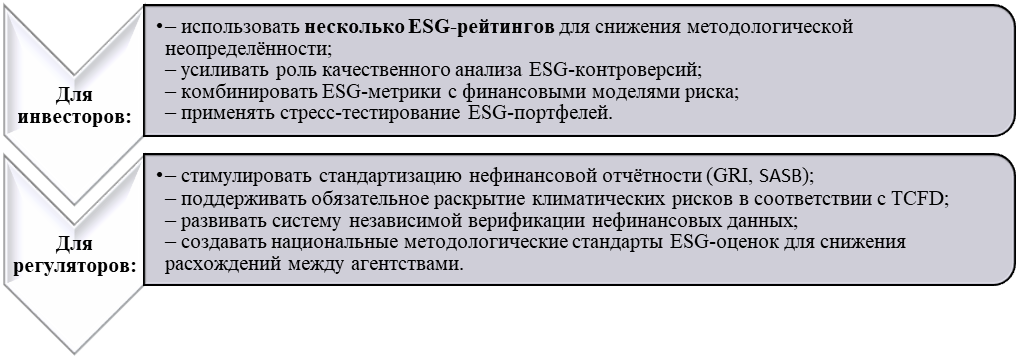 Рисунок 3 показывает, что повышение эффективности ESG-рейтингования требует комплексных действий как со стороны инвесторов, так и регуляторов. Инвесторам рекомендуется использовать мультиагентный подход, усиливать качественный анализ ESG-контроверсий и применять стресс-тестирование портфелей для повышения устойчивости стратегий. Регуляторам, в свою очередь, важно развивать стандарты нефинансовой отчётности (GRI, SASB), внедрять обязательное раскрытие климатических рисков (TCFD) и создавать национальные методологические основы ESG-оценки. Совокупность этих мер позволяет снизить методологические расхождения, повысить прозрачность данных и укрепить доверие к ESG-рейтингованию в инвестиционном процессе. [8].