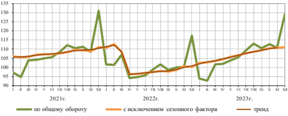 Рис. 1. Динамика оборота розничной торговли в % к среднемесячному значению 2020 года