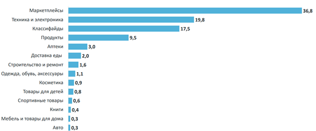 Большая часть ориентирована на маркет-плейсы. Они занимают лидирующую позицию с 36,8% потребления/использования, что указывает на их популярность и высокую востребованность среди пользователей. Находясь на втором месте, 19,8%, сервисы по доставке электроники продуктов, дают понять интерес к этой категории со стороны потребителя первой необходимости. Классифайды, 17,5%, занимают третье место, также оставаясь популярным сегментом.