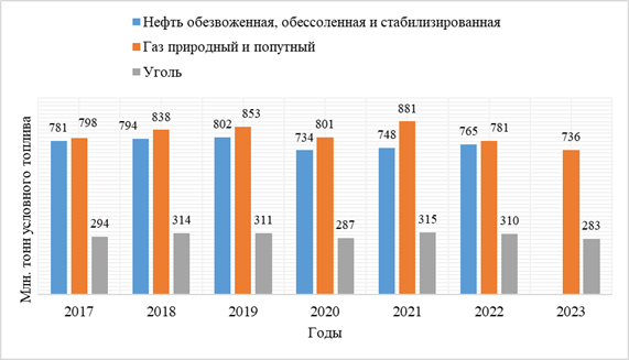 Традиционные (невозобновляемые) источники энергии являются лидирующими по всему миру и широко используются в транспорте и промышленности. Россия является одним из самых крупных мировых поставщиков энергоресурсов, что делает вопросы энергетической модернизации наиболее актуальными. Динамика производства первичных энергоресурсов представлена на Рисунке 1 (согласно распоряжению Правительства Российской Федерации от 26.04.2023 г. № 1074-р, данные по производству нефти больше не публикуются в официальной статистике).