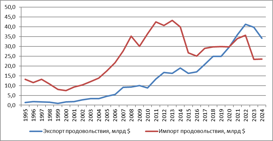 Рис. 1. Экспорт и импорт продовольствия в Российской Федерации в 1995-2024 гг., млрд $ [1], [2]