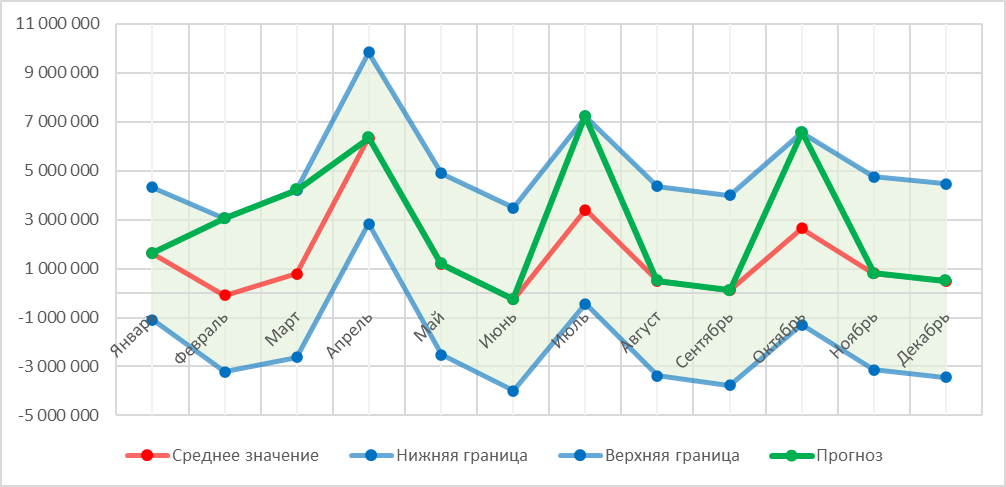 В феврале и марте в бюджет региона поступают крупные платежи по НИО – это доплата по итогам предыдущего года (2024 года). По этой причине в итоговом прогнозе в эти месяцы были выбраны верхние границы 95 % доверительного интервала. В июле в бюджет края также поступит существенный платеж за второй квартал 2025 года, а в октябре поступит крупный платеж за третий квартал текущего года – по этой же причине в этих месяцах в итоговом прогнозе учтена верхняя граница 95 % доверительного интервала первоначального прогноза VAR модели (рис. 3).
