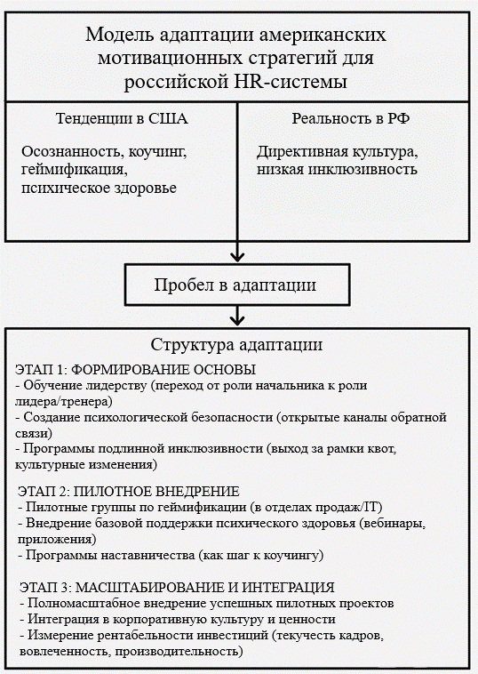 Рис. 2. Модель адаптации американских мотивационных стратегий для российской HR-системы [4, 8, 10]